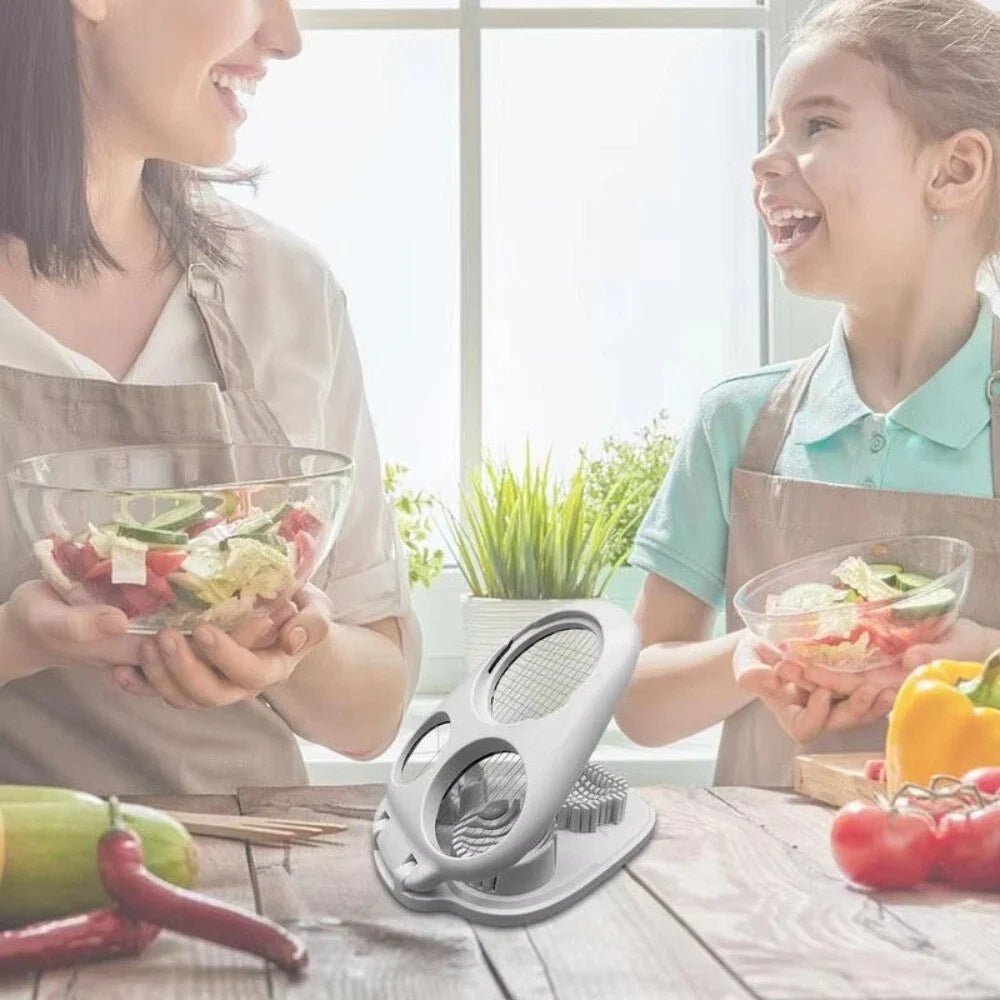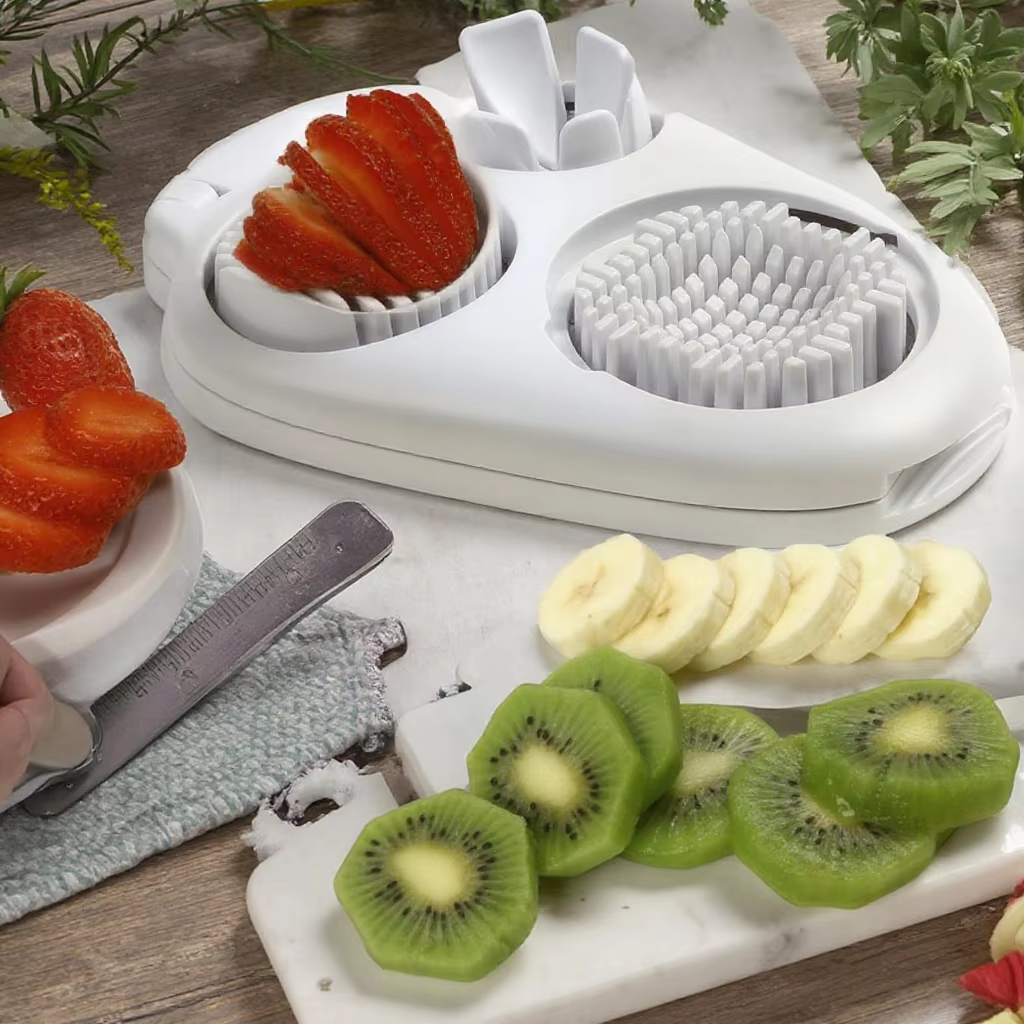 Com design ergonômico e estrutura resistente, o Fatiador Versátil Multiuso permite fatiar ovos, morangos, cogumelos, kiwi, batatas cozidas e muito mais com praticidade e zero esforço.