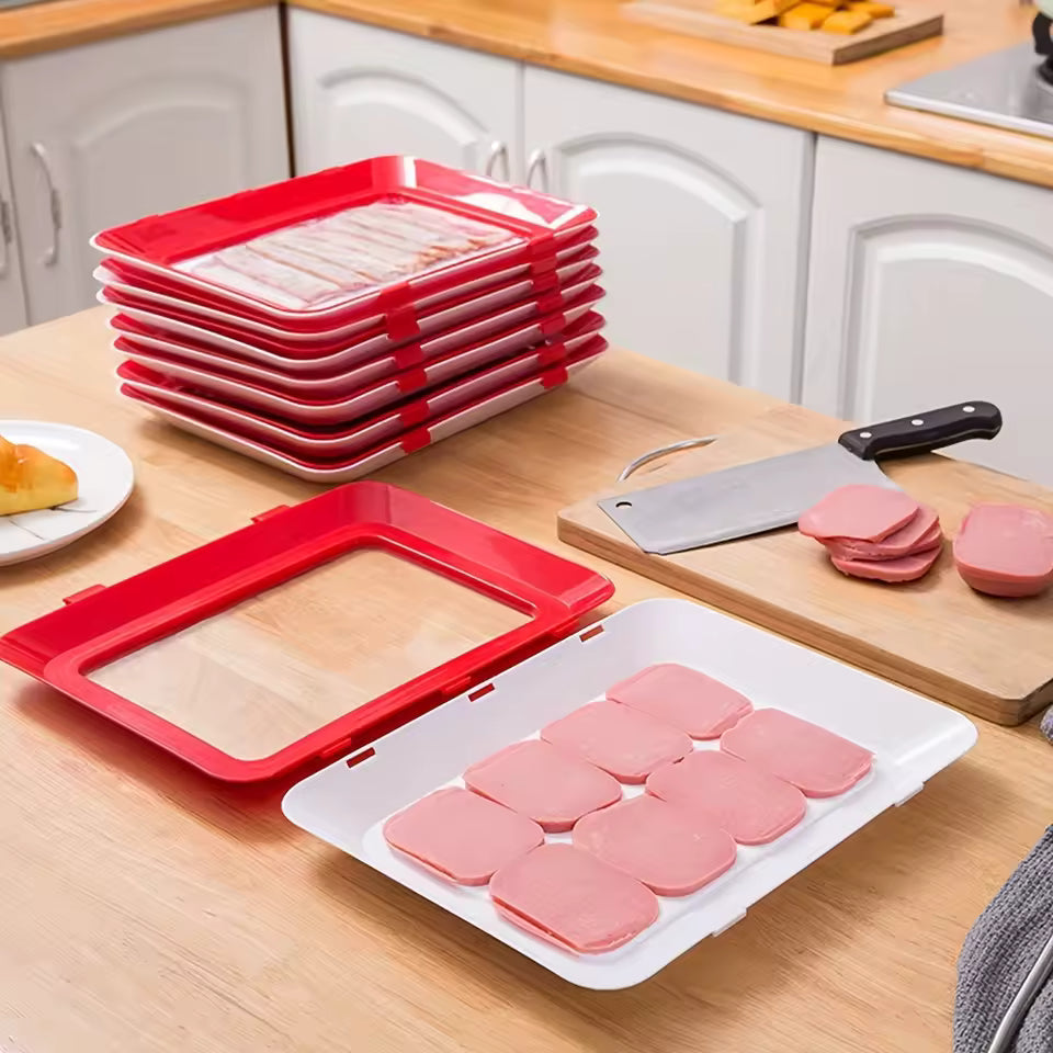 Basta pressionar a tampa para criar o vácuo e pronto! Você pode empilhar várias bandejas, economizando espaço na geladeira ou no freezer.